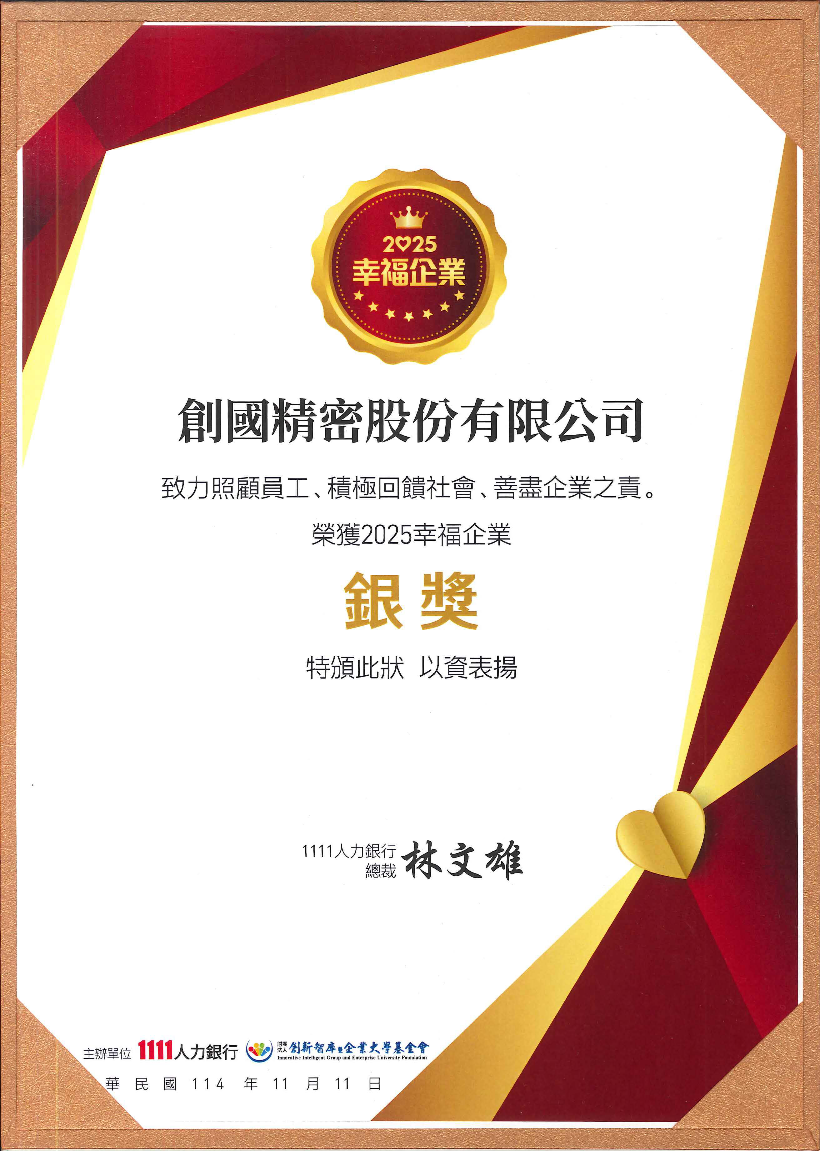 TCT台灣總公司-創國精密股份有限公司在陶執行長嘉莉的領導下,榮獲2025幸福企業銀獎,並由1111人力銀行頒發證書乙只及電子徽章。